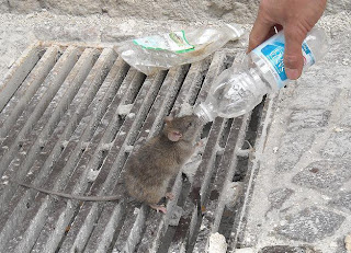 Před pár dny se mi dále poštěstila trochu kuriózní „záchrana“ holuba. Na Staroměstském náměstí v Praze jsem si všimla holuba, který měl na krku provlečenou uschlou kůrku z vydlabaného krajíce chleba, vypadalo to, jako by měl chomout. Asi někde holubi krajíc chleba našli, vyzobali vnitřek a nějak ve snaze uzobnout si krajíc nadhodili a jednomu se zachytil na krku. V horším případě ho nějaký blbec chytil a chleba mu na krk provléknul, aby to bylo vtipné, nevím. Každopádně už mu pod tím nerostlo peří a příjemné to určitě nebylo, při létání ani při chůzi. Chytit se jen tak nenechal, takže na řadu přišla svačina a získávání důvěry. Pochopitelně se k rozdávání chleba slétla celá smečka, a tedy jsem tam dřepěla, plazila se za holubem s kůrkou na krku a pomalu ho lákala na drobky, a manévrovala mezi několika dalšími, kteří se chtěli na záchraně přiživit. Vtipné na tom bylo, že ten den na onom místě postavili ceduli Zákaz krmení holubů pod pokutou. Také se po pár minutách zjevila policejní hlídka, díkybohu mě nepovažovali za rušitele pořádku, takže jsem mohla pokračovat. Po úspěšném směřování drobků k žádoucímu holubovi o mě začal jevit větší zájem, takže jsem k němu postupně přibližovala ruku a nabízela mu, aby mi z ruky zobnul. K jeho smůle byl přítomen otrlejší Pišta1, který mi bez ostychu uzobával z druhé ruky přímo z housky. Takže jsem střídavě nabízela holubovi s „chomoutem“ a krmila holuba u housky. Nakonec, celkem asi po půl hodině, se kýžený holub osmělil a vzal si drobek z ruky. Pak už byla důvěra navozena a po chvilce jsem na něj mohla sáhnout a kůrku rozlomit. Najednou byla celá kůra z krajíce na zemi a můj milý holoubek ochlebíčkovaný se zamíchal mezi ostatní, poznala jsem ho pak ještě jednou podle opelichaného pásku na krku. Už ale bylo vše hotovo, tak jsem jim všem nadrobila ještě porci housky a mizela odtamtud, protože se už slétali další a vypadalo to na nedovolené shromažďování. Doufám tedy, že se holoubkovi bez chleba na krku chodí i létá líp :)